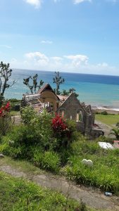 The land wasn’t always that flat. There was a beautiful border of shrubs bearing assorted colours of hibiscus flowers. The hedge lined the front of the presbytery verandah uphill (not shown); and the land sloped gently down towards a row of cedar trees, Pink Poui (Pow-yea) at the edge of a sharp cliff that dipped into a ravine. Between the ravine and the sea-shore, there was just enough space for one family house the road which reached the Two-Pound toll point and then winded up the cliff to the church, my school, the presbytery and cemetery. Above that was the boys’ school accessible via a steep track.